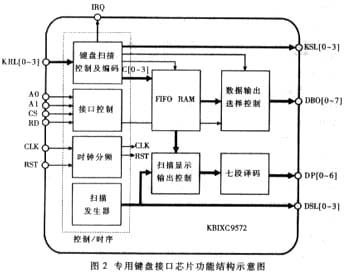 2 专用键盘接口芯片功能结构设计   根据上述专用键盘芯片KB-CORE的功能要求,图2示出本芯片内部应有的结构框图。其工作原理如下:(1)键盘扫描控制及编码电路中内含一个环形计数器。该计数器计数输出至KSL [0~3]端作为键盘扫描信号。每当扫描信号发生变化时,键盘扫描控制器从KRL[0~3]端读入某一行按键的状态信号。如果没有按键被按下,则扫描下一行;如果有按键被按下,则控制器锁定被扫描行,并延迟约10ms去抖动,然后再次扫描被锁定行以确定按键是否误读。如果按键被证实按下,则一直等待直至用户松开该键。与此同时,数字键码将被保存到先进先出存储器,功能键则直接产生中断请求信号IRQ,通知CPU读取键码DBO[0~7]。(2)FIFO RAM中数据容量为16位。每4位对应一个字形符,所以七段LED数码管需要4位。(3)扫描发生器一方面产生LED的位选信号DSL[0~3],另一方面产生扫描显示输出控制电路的位数据选通信号。扫描显示输出控制电路根据位数据选通信号读取FIFO RAM中相对应的数据,然后送七段译码电路输出DP[0~6]驱动LED显示屏的段选信号电极。(4)接口控制电路一方面用来识别CPU的读时序;另一方面用来对地址信号线A1A0译码,实现对输出数据的选择。若A0A1="00",则输出FIFO RAM中的低字节数据;若A0A1="01",则输出FIFO RAM中的高字节数据;若A0A1="10",则输出控制数据(表明ROW、COL、DAT中哪一个被按下);若A0A1="11",则不输出FIFO RAM中的任何数据。