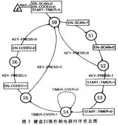 为了实现上述专用键盘接口芯片功能结构,利用可编程逻辑技术对各个功能块进行逻辑时序描述和实现。由于键盘扫描控制和去抖的逻辑时序设计较复杂并具典型性,因此下面将对键盘扫描控制和去抖部分的设计思想进行介绍。    键盘扫描时序的基本原理可以用图3所示的状态图表示。状态图的输入变量为RST(复位)、KEY-PRESS(有按键)、TIMER-OVER(去抖动延时结束);输出变量包括EN-SCAN(扫描行转移)、EN-CODED(键盘编码启动)、START-TIMER(开启去抖动延时)。从图3中知道,状态S0→S1→S2为按键扫描状态链,状态S3→S4→S5为去抖延时状态链,状态S6为按键保持期。当按键被按下时,进入启动(S3)去抖延时状态链;去抖延时结束后(S5),若按键没有按下则恢复扫描状态链(S0);若按键确认被按下则进入保持期(S6),并输出按键编码维持至按键松开。